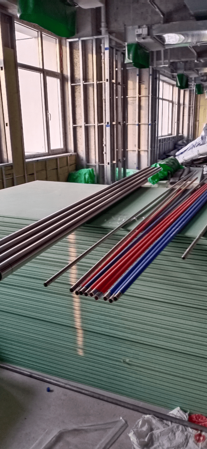 本次項目主體為該院在建病房樓給排水工程。該病房樓共計12層,建筑面積21600平米。項目采用久潤利華雙卡壓式不銹鋼水管,應(yīng)用產(chǎn)品型號為DN15-DN65。該工程主要由久潤利華—臨淄代理王俊永參與,全程包括材料供應(yīng),施工安裝及總公司提供的技術(shù)指導(dǎo)。工程主要涉及醫(yī)療類建筑物供水管道系統(tǒng)的冷熱水供應(yīng),直飲水等板塊。不銹鋼水管安全、無毒、無腐蝕、無滲出物、無異味、無渾濁,不會對水質(zhì)造成二次污染,能夠保持水質(zhì)純凈衛(wèi)生,適用于各大醫(yī)療類建筑。 點評:大型醫(yī)療綜合體涉及醫(yī)用軟水、直飲水、生活用水等多種品質(zhì)要求,用水量大,品質(zhì)高,要求管道可靠性高,易維護,宜選用不銹鋼管道作為供水管材。 以下為部分施工現(xiàn)場圖片